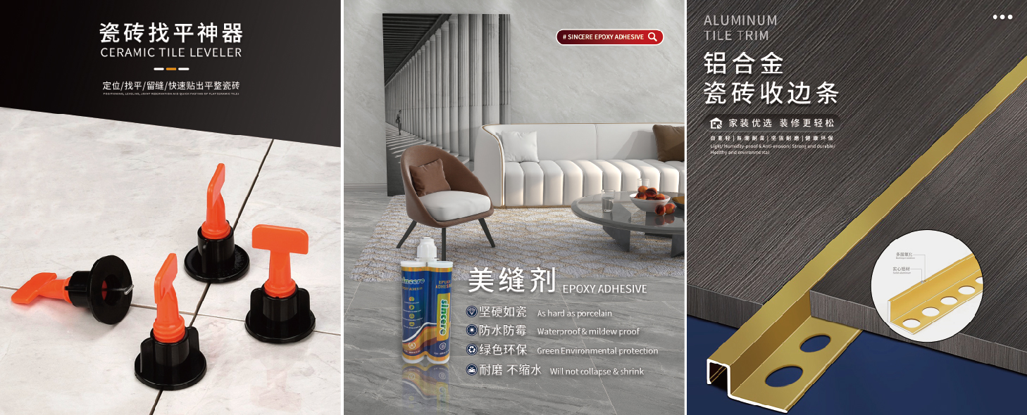 满足全球采购家购买需要,迅亚产品涵盖2000多款引领时代发展趋势的瓷砖产品、石塑地板产品以及美缝剂、找平器、金属装饰铝条等建材配件。