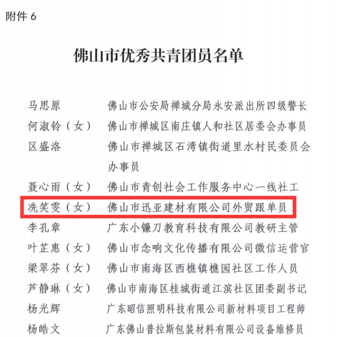 2021年5月8日,共青团佛山市委员会公布《关于表彰2020-2021年度佛山市五四红旗团委(标兵)、五四红旗团支部(标兵)、优秀共青团干部、优秀共青团员的决定》,佛山市迅亚建材有限公司团支部团员冼笑雯荣获市“优秀共青团员”荣誉称号。